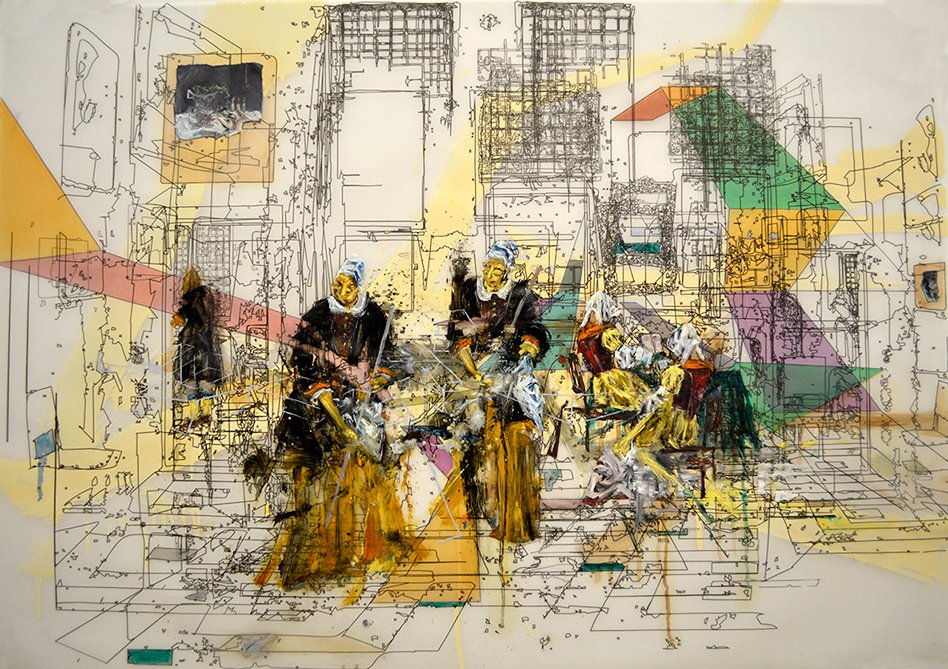 “Interior with Painter, Woman reading and Maid sweeping Nº 1 ” / Mixed Media on translucent paper / 70 x 100 cm / .